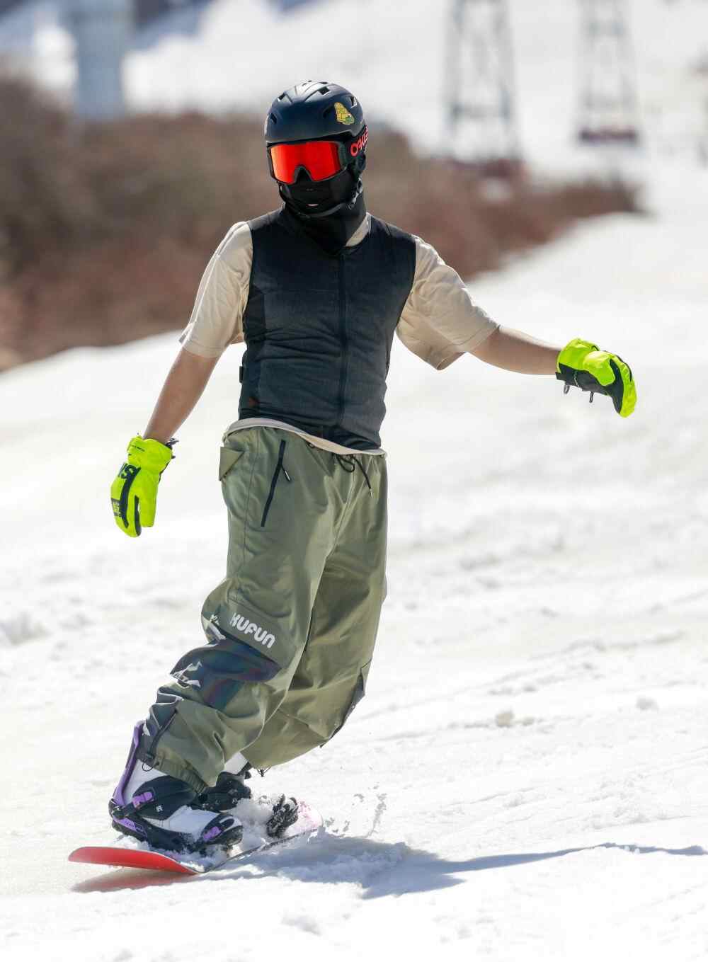 4月5日, 一名身着短袖的滑雪爱好者在新疆丝绸之路山地度假区滑雪,当日当地最高气温已达到二十摄氏度左右。