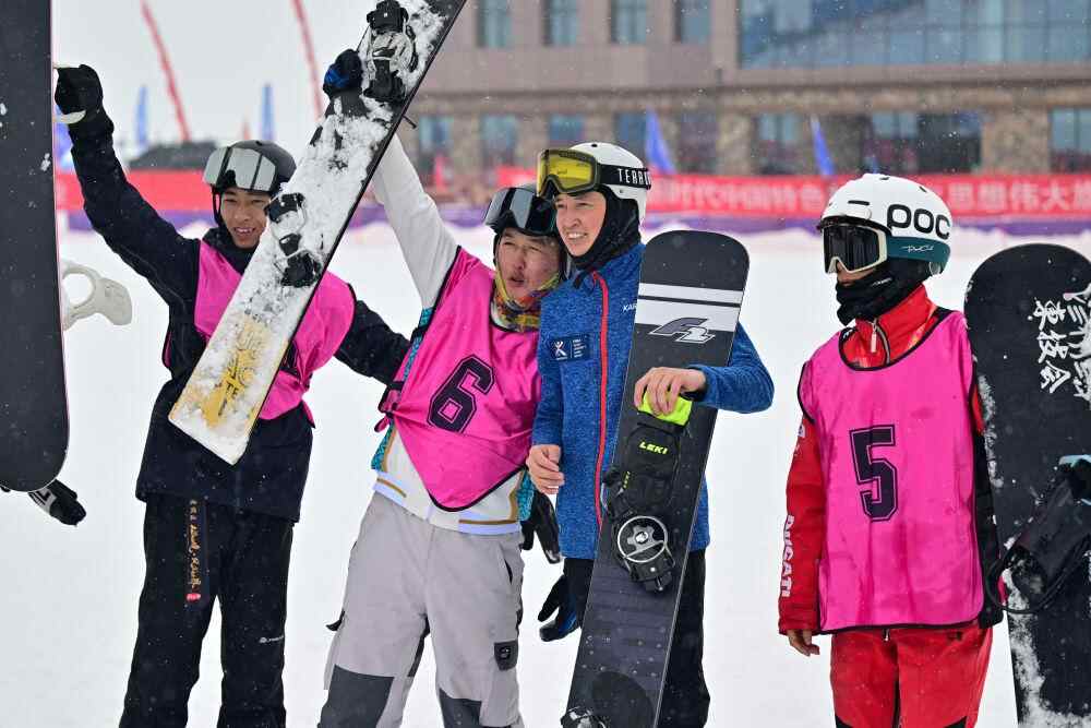 3月1日,中外滑雪运动员在2025年“冰雪丝路杯”那拉提国际高山滑雪邀请赛后合影庆祝。