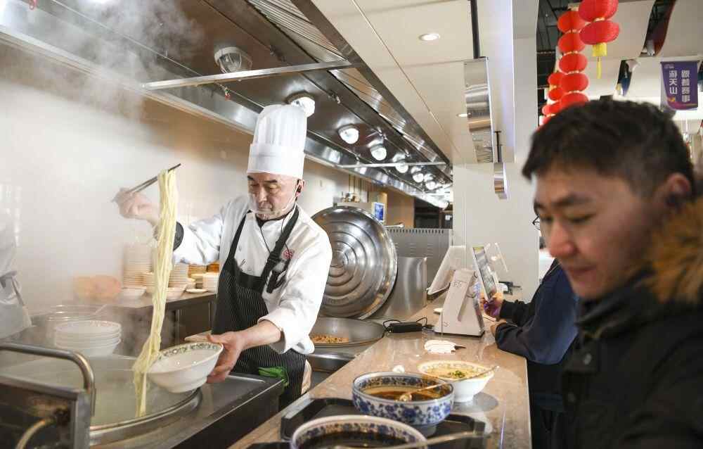 新疆天山天池国际滑雪场的商户为雪友煮牛肉面(2024年12月12日摄)。