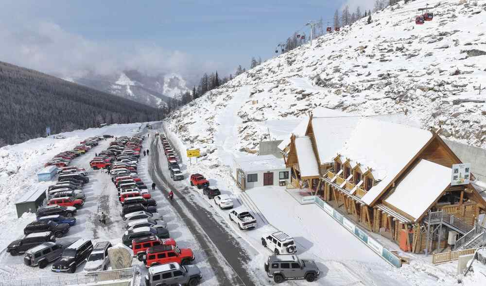 3月5日,雪友的车辆停靠在新疆阿勒泰可可托海国际滑雪度假区(无人机照片)。新华社发(可可托海国际滑雪度假区供图)