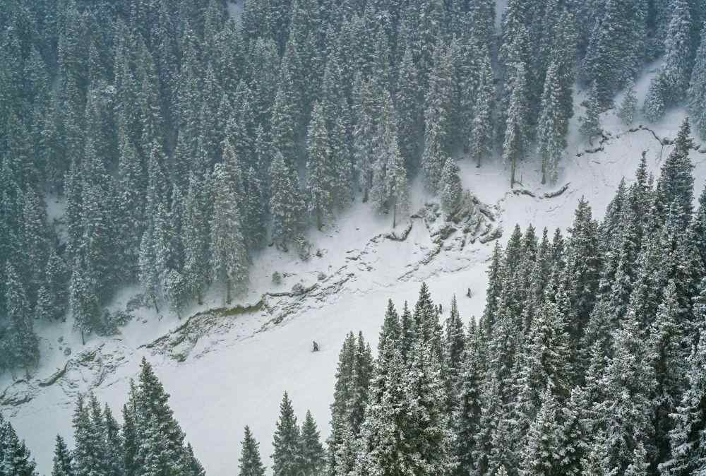 世界野雪巡回赛2024-2025雪季中国新疆禾木站工作人员在禾木吉克普林国际滑雪度假区踏勘比赛场地(2024年12月4日摄,无人机照片)。