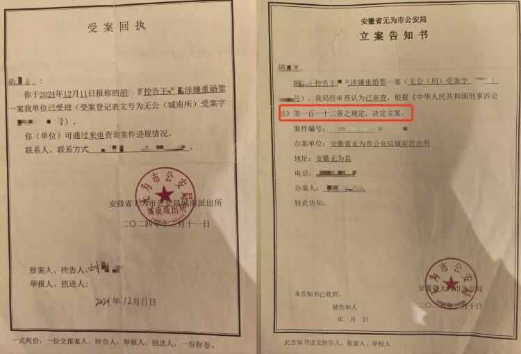 2024年12月11日,安徽省无为市公安局城南派出所受理了胡女士控告王某涉嫌重婚罪一案。2025年2月10日,无为市公安局审查后,决定立案。同日,还受理了胡女士控告王某的诈骗案。