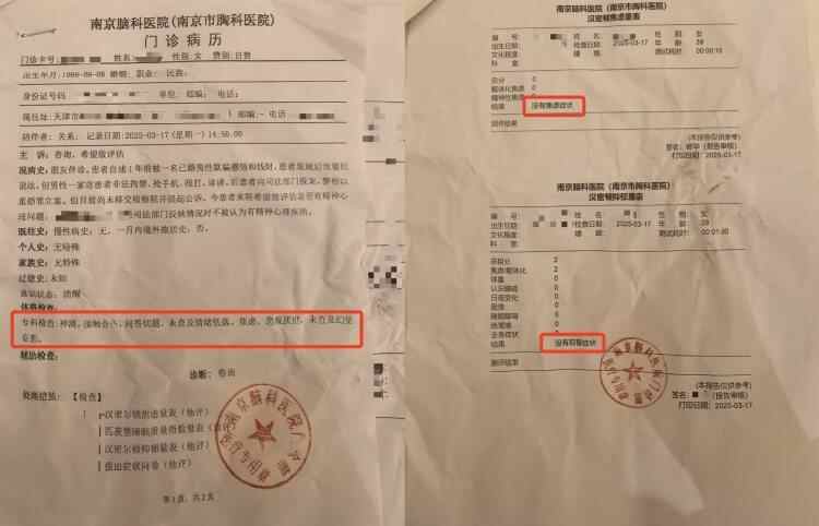 “家人接我出院后,我们第一时间到南京的医院做了检查,检查证明,我没有精神疾病。”南京市脑科医院检查报告显示,经检查,胡女士并未出现焦虑、抑郁、情绪低落、悲观厌世及幻觉妄想等症状。