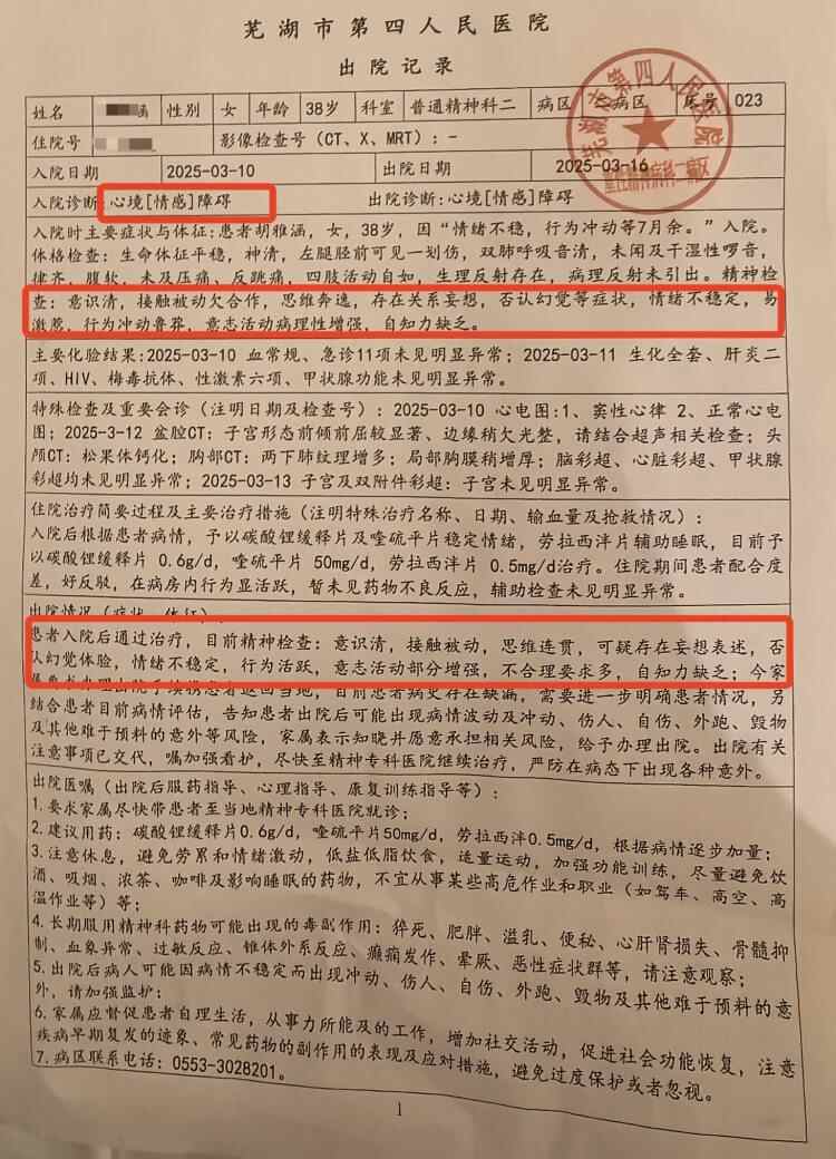 芜湖市第四人民医院出具的出院记录显示,胡女士因“情绪不稳,行为冲动”入院。精神检查时,“接触被动欠合作,思维奔逸,存在关系妄想,情绪不稳定,易激惹,行为冲动鲁莽,意志活动病理性增强,自知力缺乏。”住院期间,对其进行了药物治疗。“患者配合度差,好反驳,在病房内行为显活跃。”医生还建议家属尽快带胡女士到精神专科医院继续治疗。