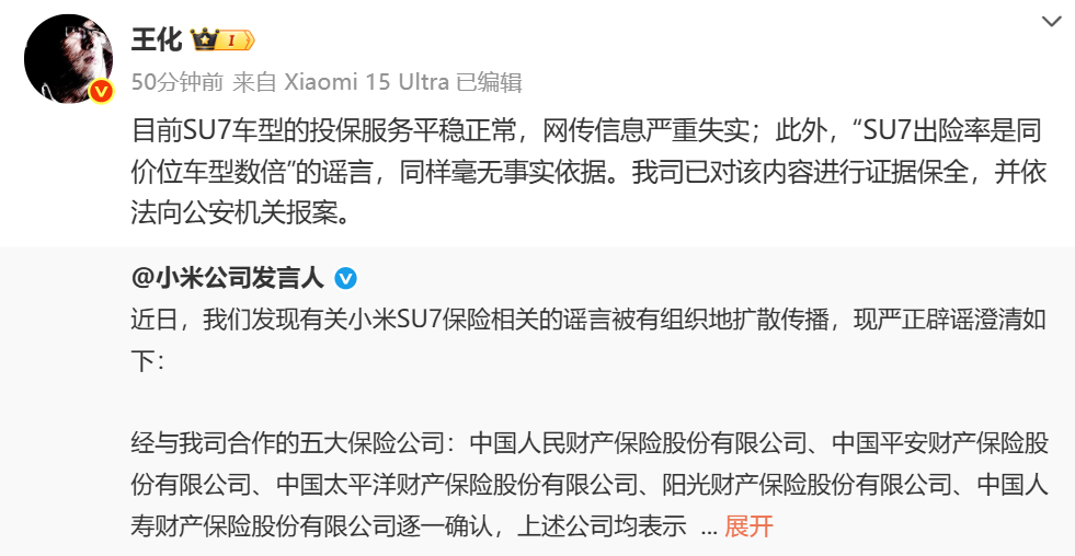 随后,小米集团公关部总经理王化转发该博文并表示:“目前,SU7车型的投保服务平稳正常,网传信息严重失实;此外,‘SU7出险率是同价位车型数倍’的谣言,同样毫无事实依据。我司已对该内容进行证据保全,并依法向公安机关报案。”