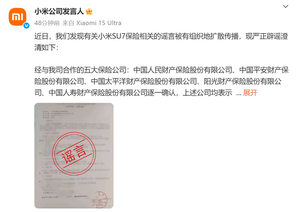 近日,我们发现有关小米SU7保险相关的谣言被有组织地扩散传播,现严正辟谣澄清如下: