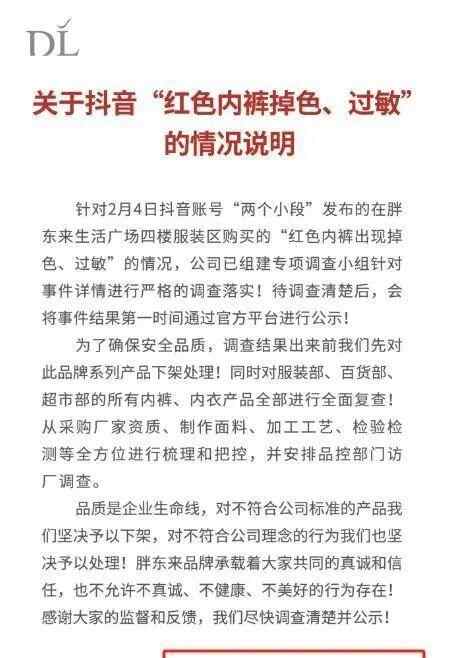 2月4日,网红“两个小段”发布视频称,自己清洗从胖东来购买的红色内裤发现掉色,并且在使用后有过敏反应。在进行投诉后,她表示胖东来工作人员的处理方式让人生气,感到不被尊重。