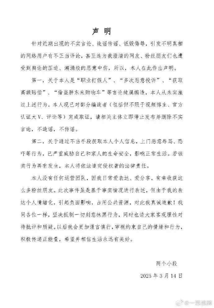 3月14日,胖东来红内裤事件当事人“两个小段”发布声明,表示关于其是“职业打假人”“多次恶意投诉”“偷盗胖东来购物车”等言论纯属编造,并晒出立案告知书,已就被诽谤一事报案。“关于通过不当手段获取本人个人信息,上门恶意辱骂,恐吓等行为已严重威胁自己和家人的生命安全,影响正常生活,若再有发生将依法追责。”