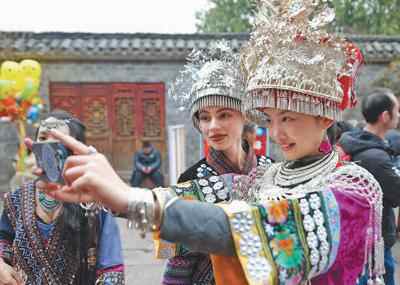 中外游客体验湘西苗族传统服饰。吴东林摄
