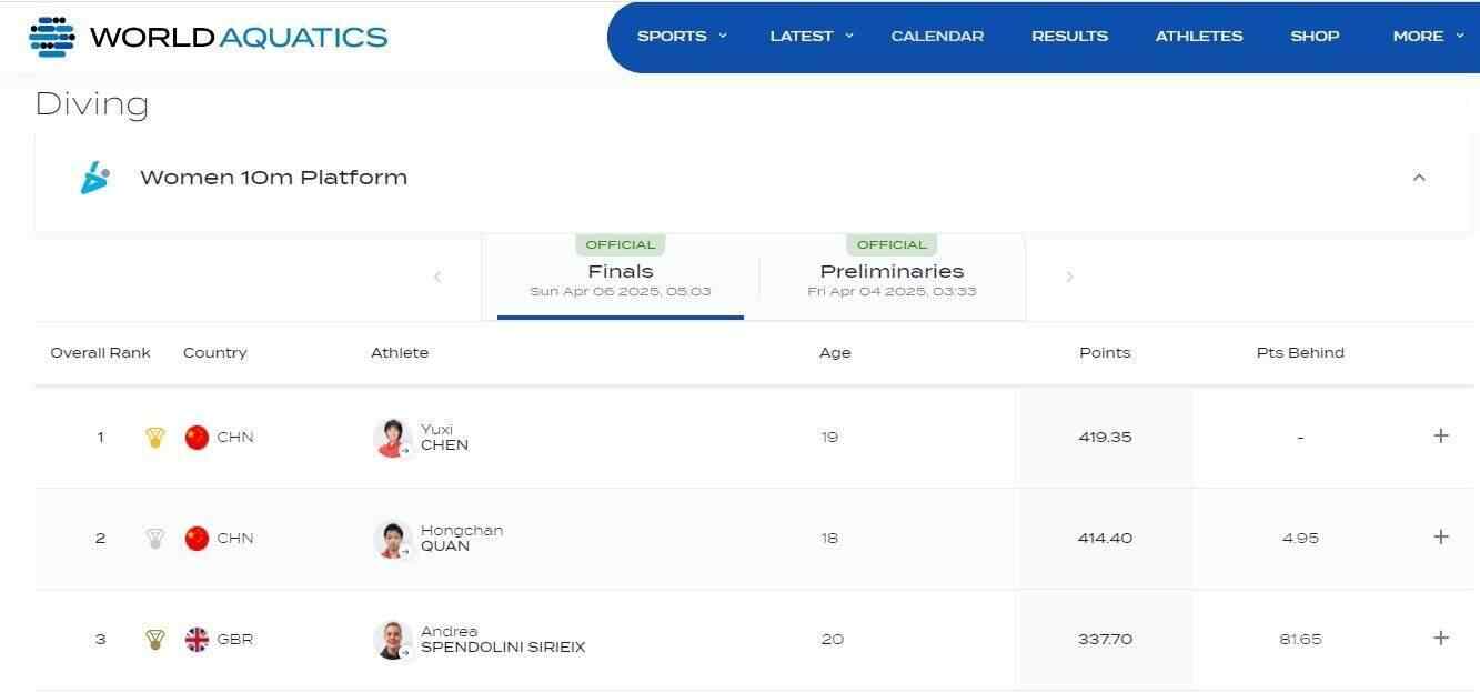陈芋汐以419.35分的成绩夺得冠军,全红婵以414.40分的成绩摘得银牌,英国选手以337.70的成绩排名第三。