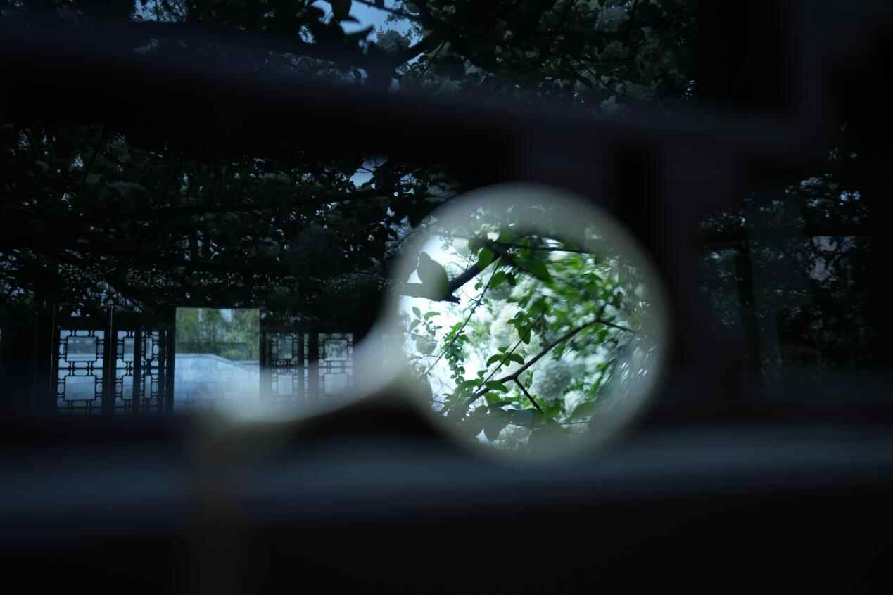 透过花窗,木绣球郁郁葱葱。邓宇轩 摄