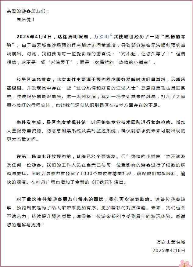 4月6日,万岁山武侠城发布《春日来信:为预约系统带来“小插曲”向您致歉》称,由于当天城寨沙场预约程序瞬时访问量激增,导致部分游客无法顺利预约当场演出。景区向每一位受影响的游客说:“对不起,让您久等了!”。