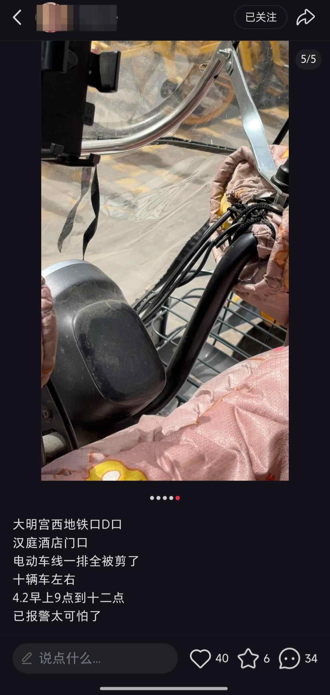 4月5日,当事网友唐女士接受记者采访时表示,她平时骑电动车上下班,会将车辆停靠在大明宫西地铁口附近,“我早上9点多停到那里,中午12点左右下楼吃饭,就发现我的刹车线被剪了。”