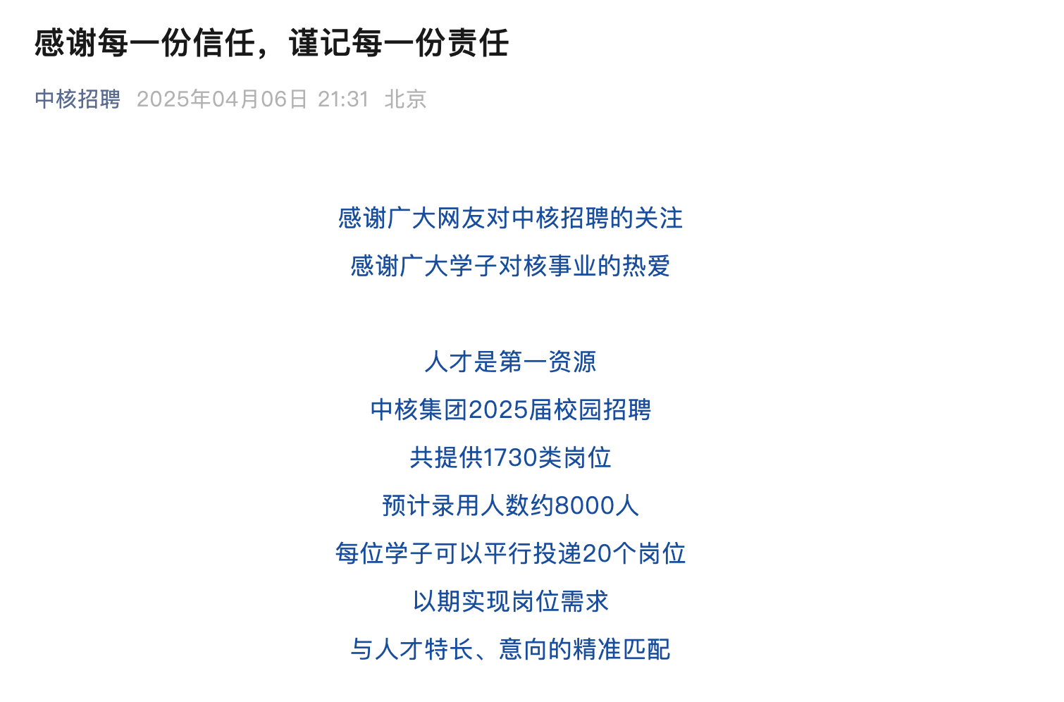 4月6日晚,中核集团招聘官微发布消息称:感谢广大网友对中核招聘的关注,感谢广大学子对核事业的热爱。