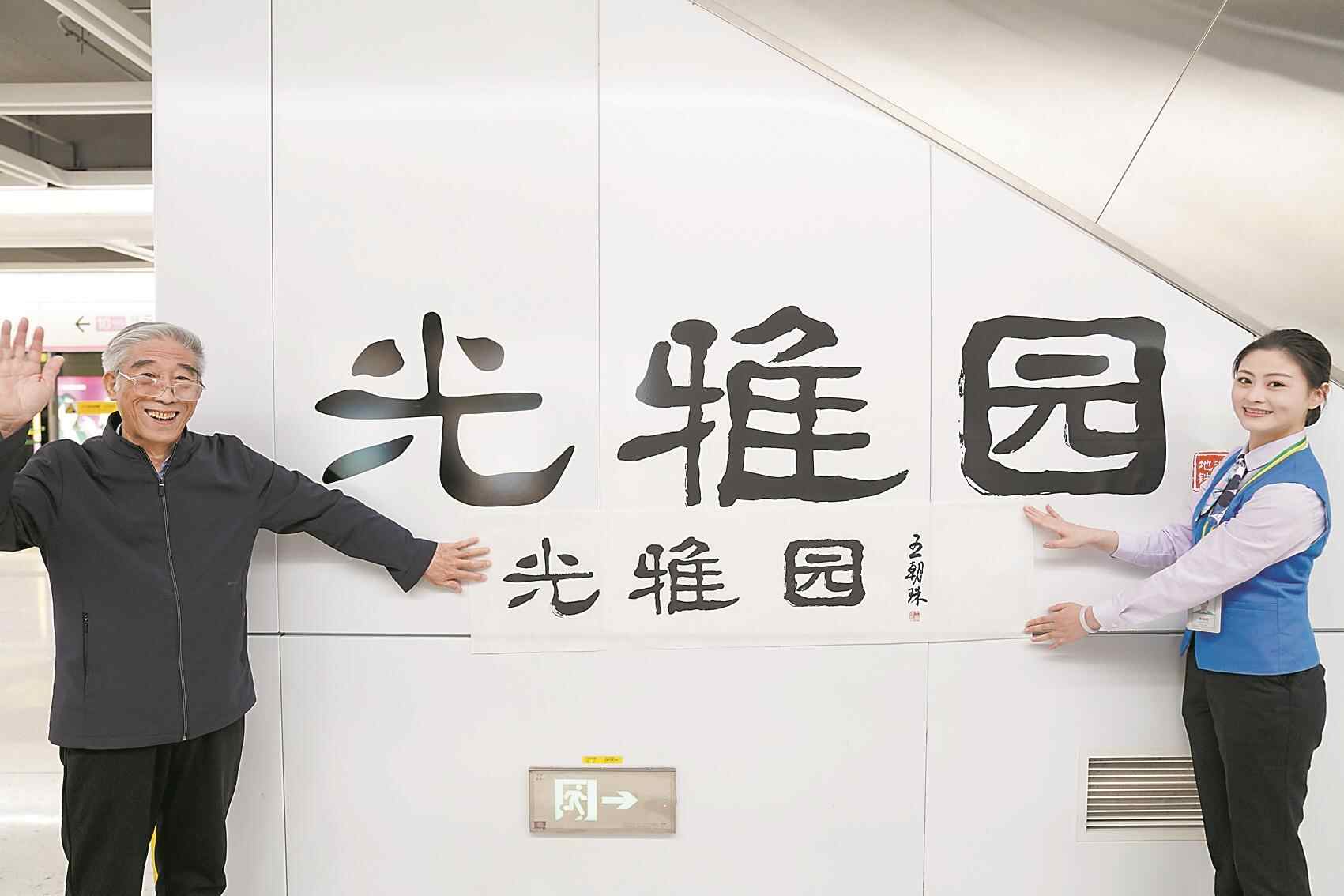 当天,王朝珠还特意到深圳地铁10号线光雅园站打卡合影。此前,深圳地铁向全国的书法爱好者公开征集10号线站名题字。王朝珠依照征稿要求,书写了隶书“光雅园”等字稿。此次来深之旅,光雅园站也是他最想看的站点。