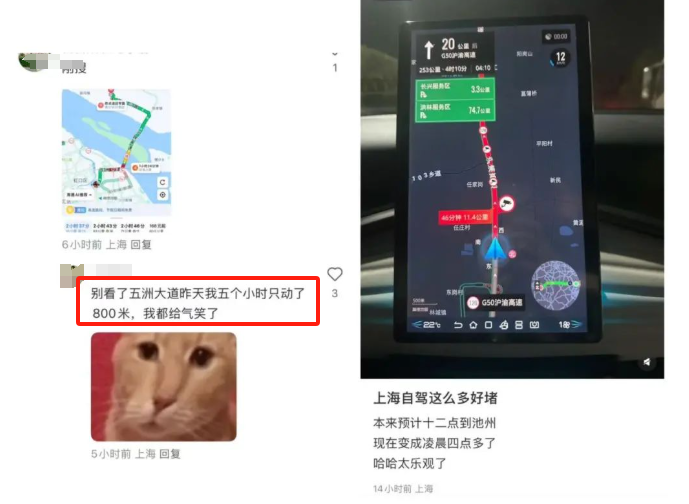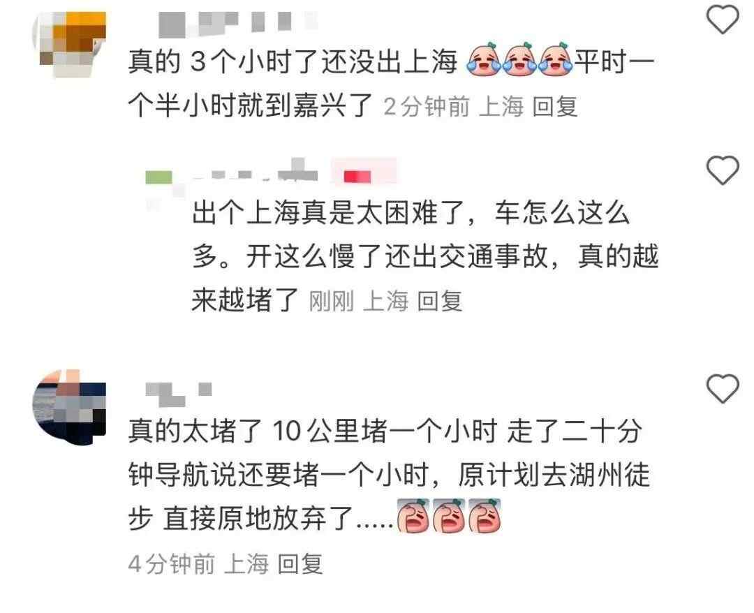 有人吐槽到处都是猪肝红,平时2小时的路走了四五个小时,还有人“5个小时只动了800米,气笑了”。
