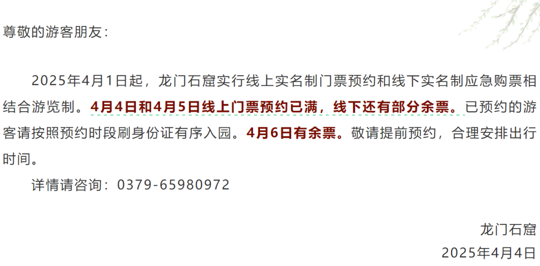龙门石窟:4月4日和4月5日线上门票预约已满。