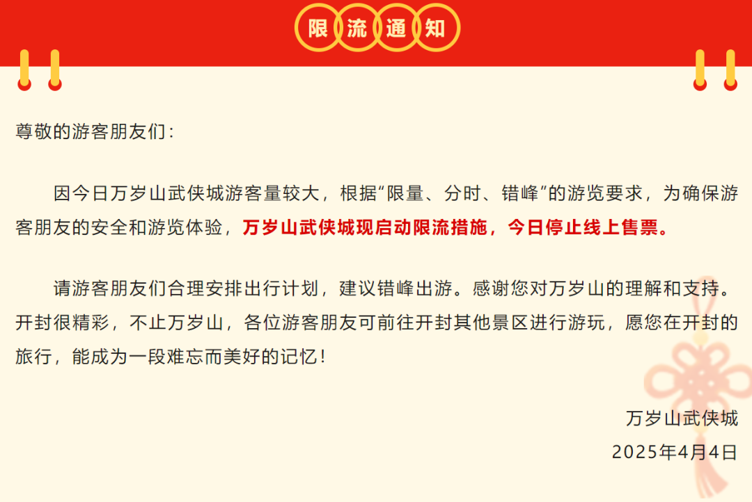 万岁山武侠城:已启动限流措施,今日停止线上售票。