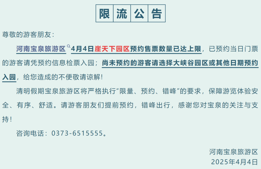 河南宝泉旅游区:4月4日崖天下园区预约售票数量已达上限。
