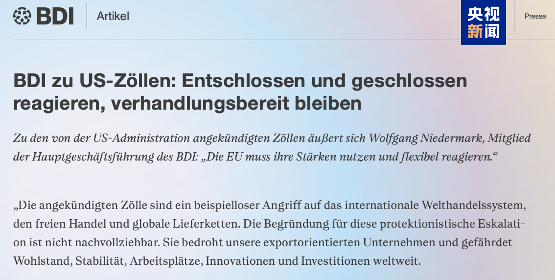 德国工业联合会在4月3日发表的声明中称,美国新关税是“对全球贸易体系、自由贸易和供应链的前所未有的攻击”,不仅会导致商品成本上涨、企业投资推迟,还可能引发供应链结构性断裂。