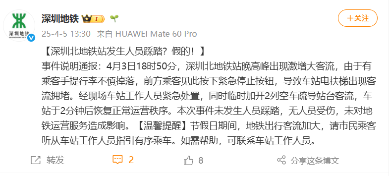 据通报,4月3日18时50分,深圳北地铁站晚高峰出现激增大客流,由于有乘客手提行李不慎掉落,前方乘客见此按下紧急停止按钮,导致车站电扶梯出现客流拥堵。经现场车站工作人员紧急处置,同时临时加开2列空车疏导站台客流,车站于2分钟后恢复正常运营秩序。