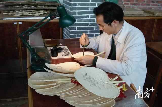 广东省工艺美术大师、新会葵艺的国家级代表性传承人正在制作葵艺扇。