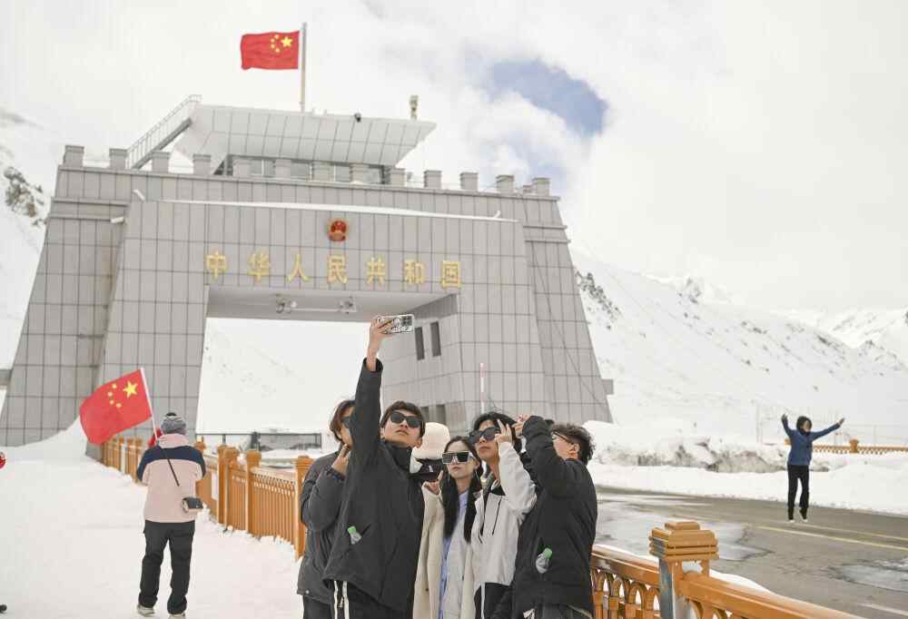 游客在新疆塔县红其拉甫国门景区拍照(2025年3月30日摄)。新华社记者 胡虎虎 摄