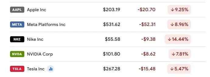 个股方面,跨国企业股票跌幅尤为明显, 其中耐克和苹果分别跌超14%和9%;科技股也普遍重挫,英伟达跌近8%,特斯拉跌超5%,Meta跌近9%。