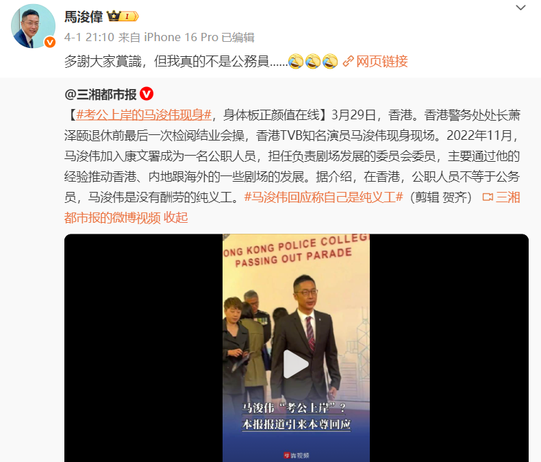4月1日,马浚伟发出2年前的采访报道澄清:“多谢大家赏识,但我真的不是公务员。”
