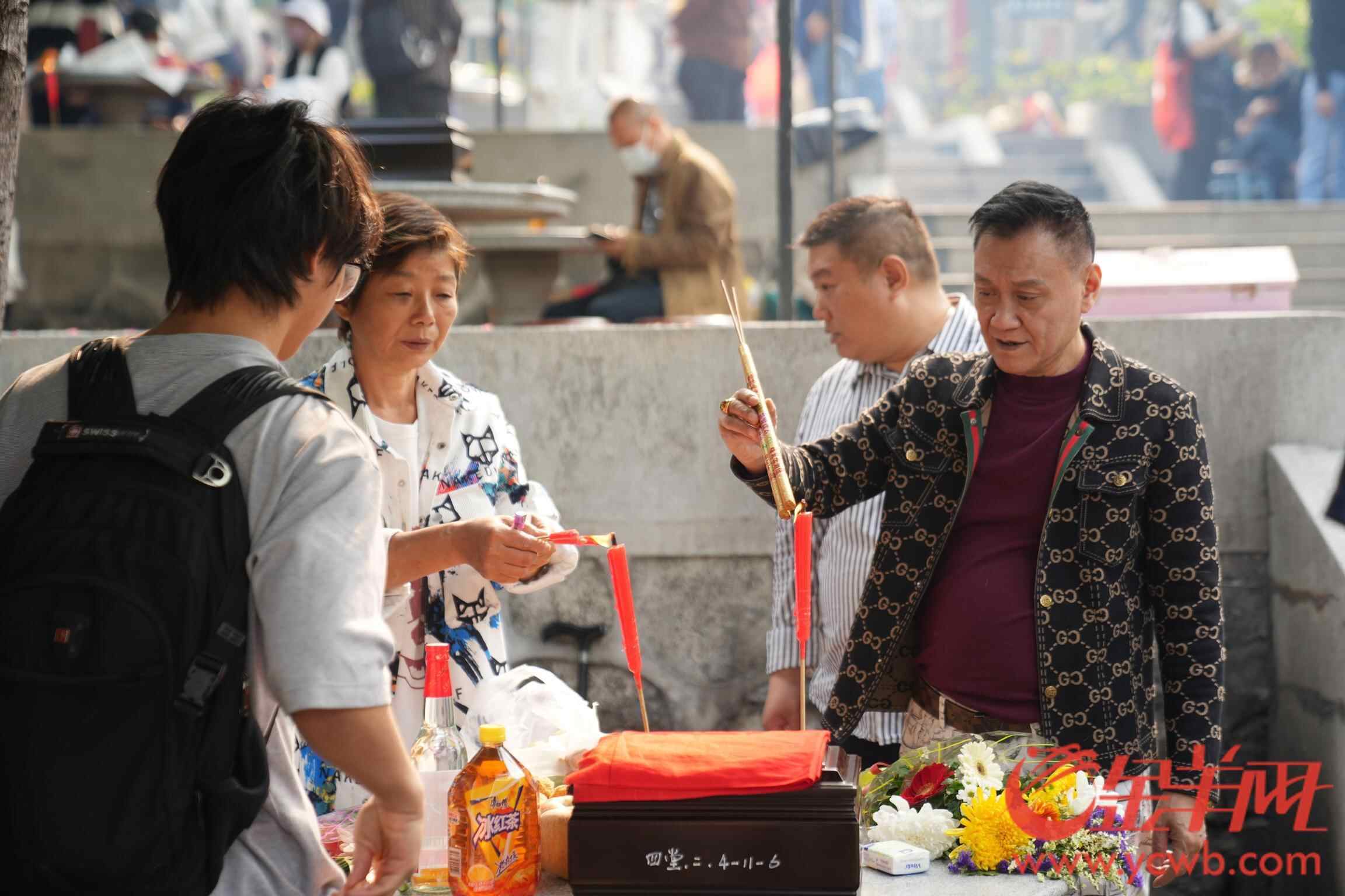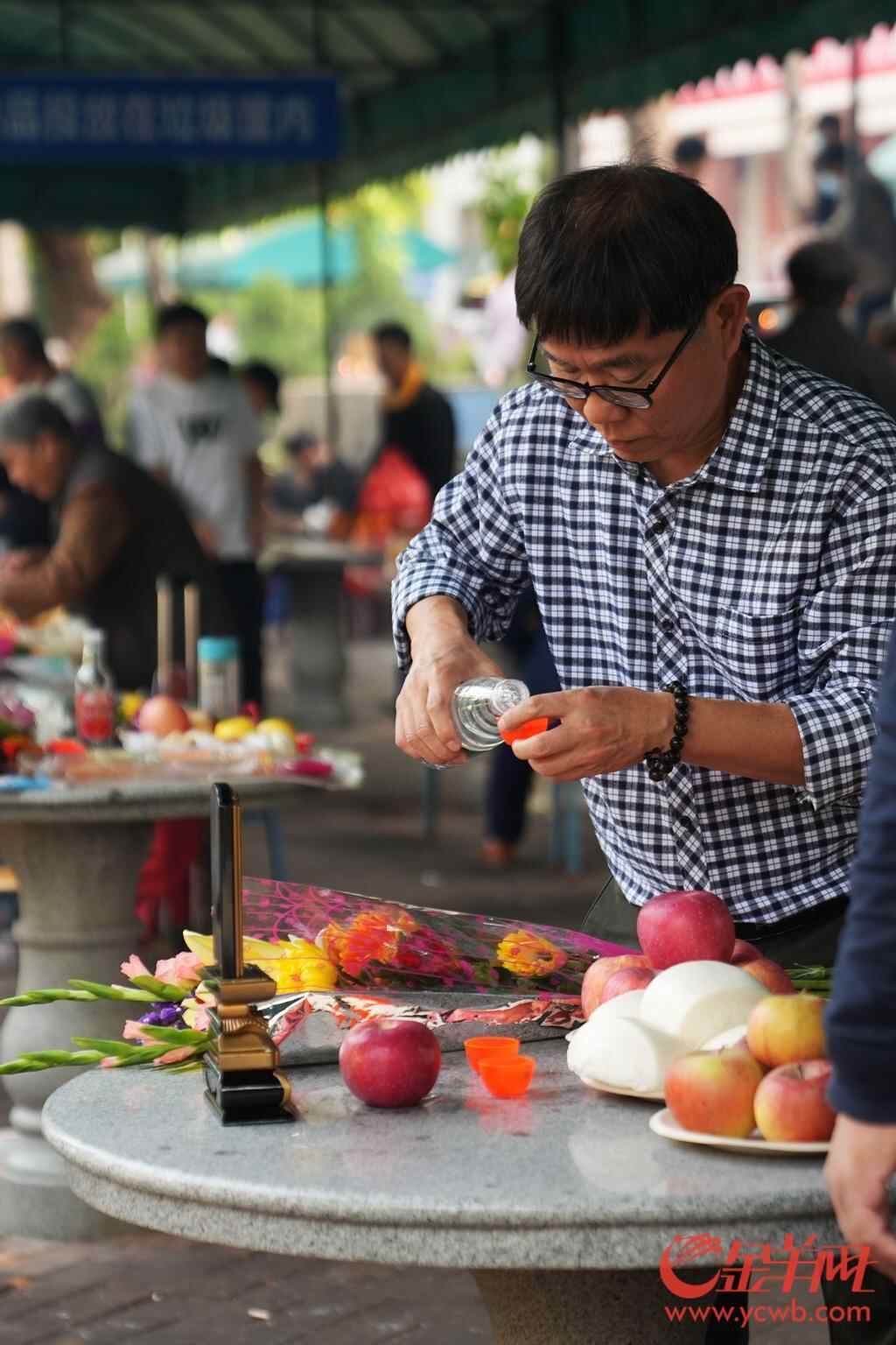 早上8点多,家住白云的欧先生就来到铭恩园的无烟拜祭区拜祭亲戚。欧先生说,今早5点就起来准备祭品,除了鲜花和水果,他还准备了炸鱼、可乐等祭品,“都是逝者生前喜欢的。”铭恩园今年继续提供电子香炉免费供市民租用,欧先生也租了一台,“无烟更环保,心意到了就好。”他说。