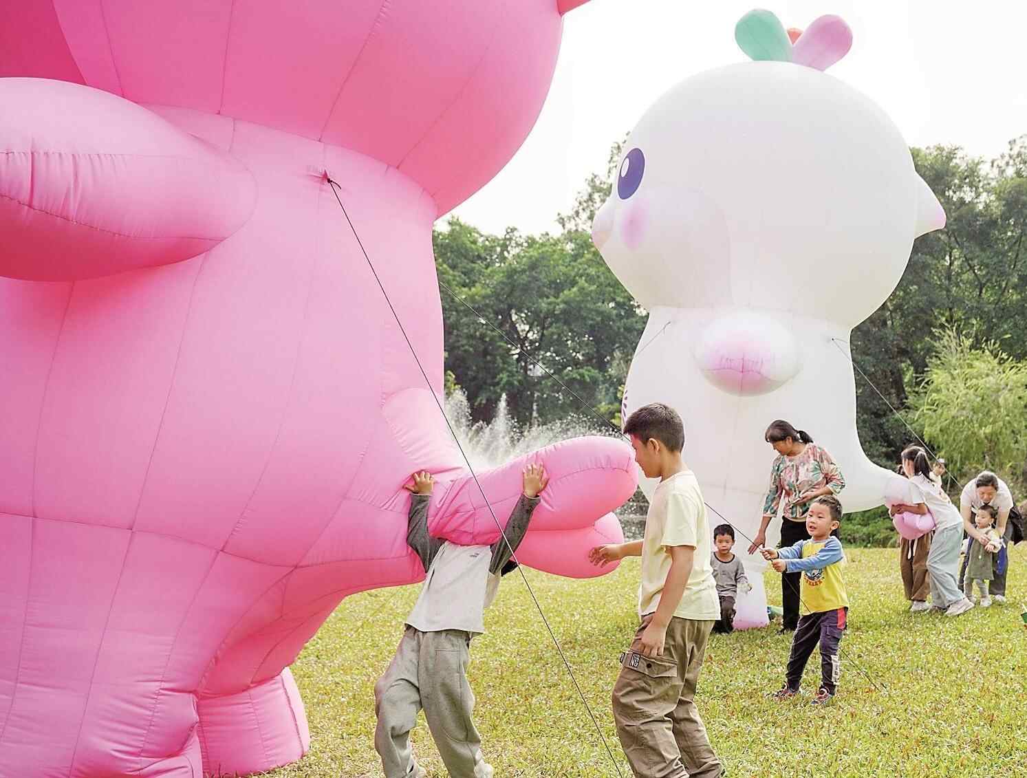 25日下午,广州麓湖公园聚芳园的草地上,两只巨型的十五运会吉祥物“喜洋洋”“乐融融”,收获了大小朋友们的喜爱。