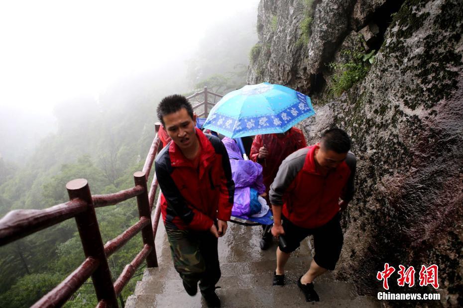 7月6日,河南洛阳老君山,一名来自北京的60岁左右的女游客在峰林十里画屏突发疾病,发生眩晕,四肢动弹不得,情况紧急,老君山出动医疗应急救援人员立即赶赴现场,进行简单应急处理后,和闻讯赶来的道士进行爱心接力,冒着大雨在深山悬空栈道上快速奔进,经过大家的齐心协作,安全、快速地将病人送至山下做进一步的治疗处理。中新社记者 王中举 摄
