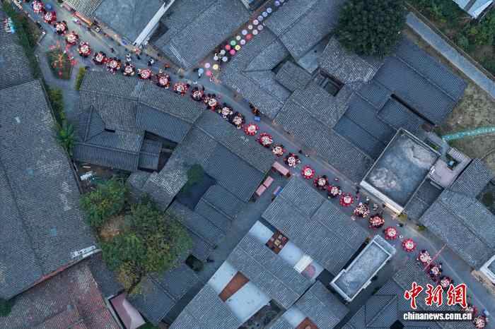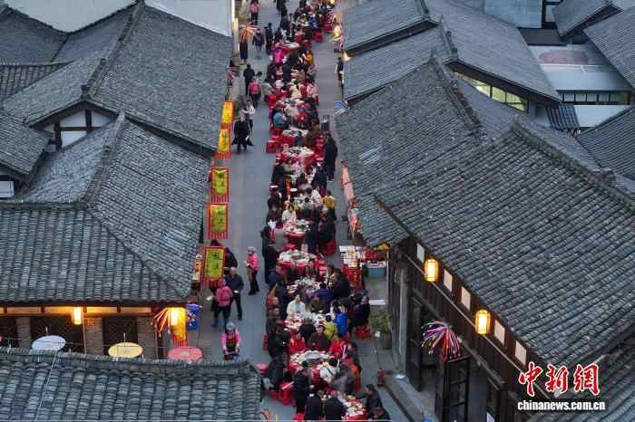 12月20日,四川眉山市东坡区太和镇老街暖意融融,羊肉的香气弥漫老街,千余名民众齐聚一堂,共品鲜香醇厚的羊肉汤锅,提前迎接冬至佳节的到来。图为眉山东坡太和老街羊肉汤锅长街宴现场。(无人机照片)中新社记者 刘忠俊 摄