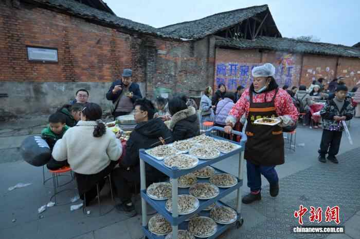 12月20日,四川眉山市东坡区太和镇老街暖意融融,羊肉的香气弥漫老街,千余名民众齐聚一堂,共品鲜香醇厚的羊肉汤锅,提前迎接冬至佳节的到来。图为老街上工作人员忙着给大家送上鲜美的羊肉等。中新社记者 刘忠俊 摄
