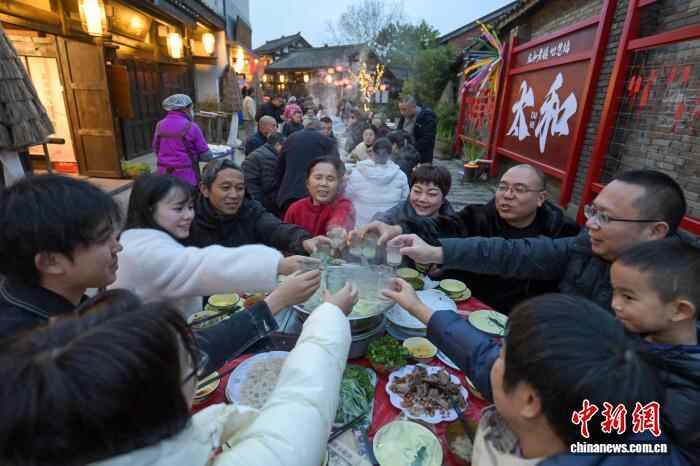 12月20日,四川眉山市东坡区太和镇老街暖意融融,羊肉的香气弥漫老街,千余名民众齐聚一堂,共品鲜香醇厚的羊肉汤锅,提前迎接冬至佳节的到来。图为老街上民众举杯共迎冬至。中新社记者 刘忠俊 摄