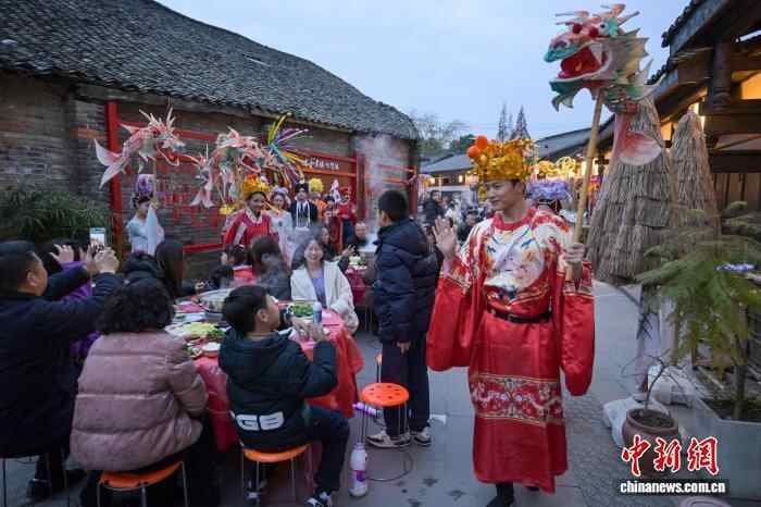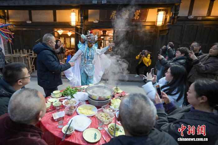 12月20日,四川眉山市东坡区太和镇老街暖意融融,羊肉的香气弥漫老街,千余名民众齐聚一堂,共品鲜香醇厚的羊肉汤锅,提前迎接冬至佳节的到来。图为太和老街上民众边品尝羊肉汤锅,边欣赏川剧变脸表演。中新社记者 刘忠俊 摄