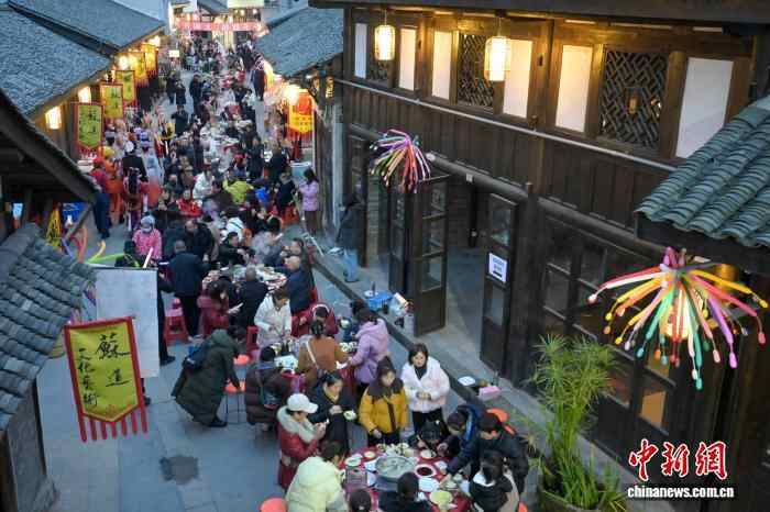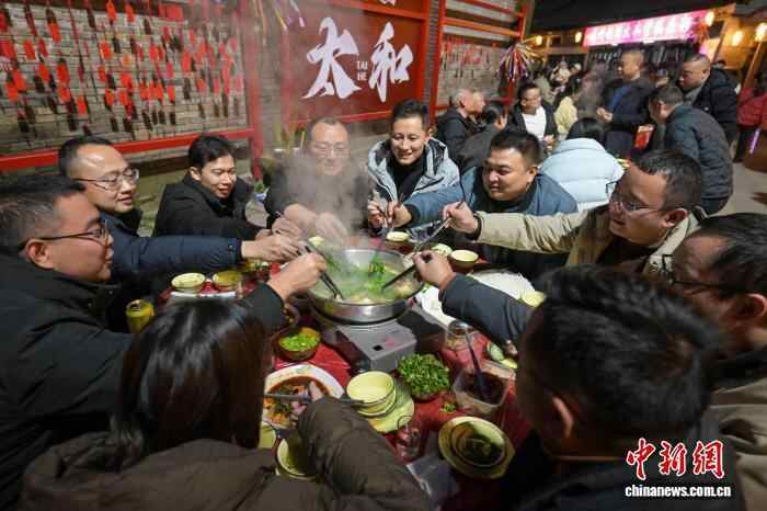 12月20日,四川眉山市东坡区太和镇老街暖意融融,羊肉的香气弥漫老街,千余名民众齐聚一堂,共品鲜香醇厚的羊肉汤锅,提前迎接冬至佳节的到来。图为眉山东坡太和老街烟火气浓浓。中新社记者 刘忠俊 摄