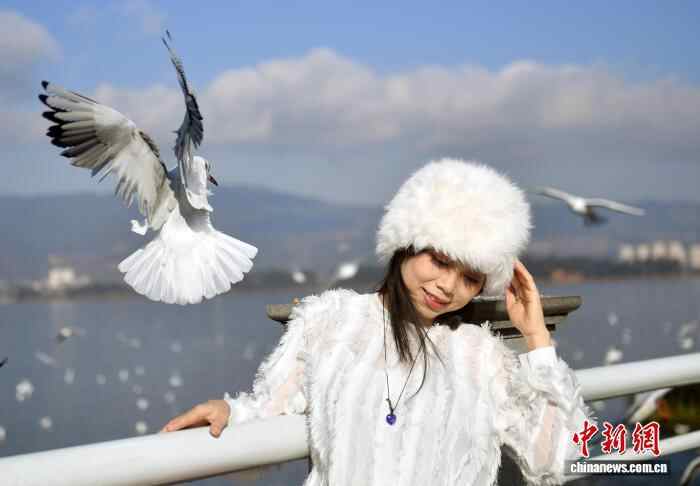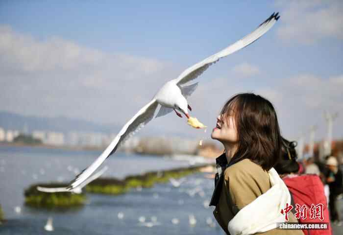 12月20日,一名游客与红嘴鸥互动。当日,众多游客在云南省昆明市滇池畔海埂大坝观鸥、喂鸥。滇池是红嘴鸥在云南的主要越冬地,每年观鸥季,吸引众多游客前来“打卡”。中新社记者 黄兴鸿 摄
