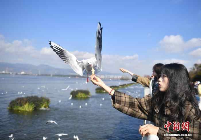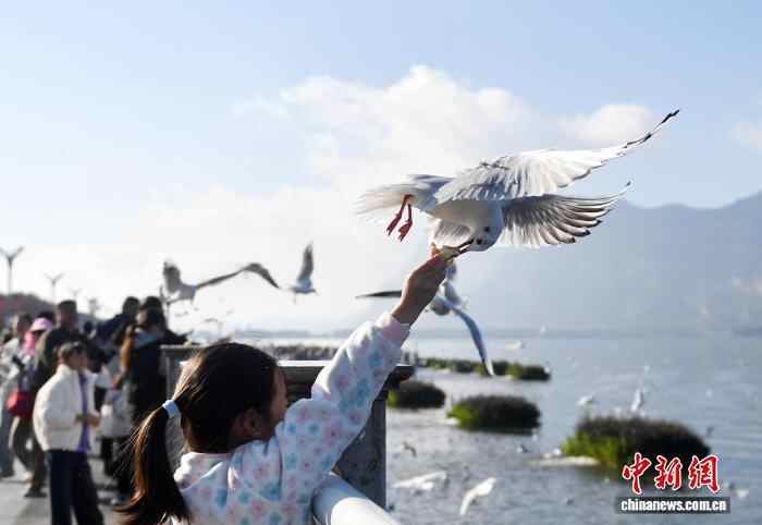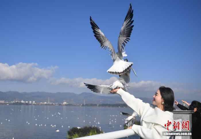 12月20日,游客观鸥、喂鸥。当日,众多游客在云南省昆明市滇池畔海埂大坝观鸥、喂鸥。滇池是红嘴鸥在云南的主要越冬地,每年观鸥季,吸引众多游客前来“打卡”。中新社记者 黄兴鸿 摄