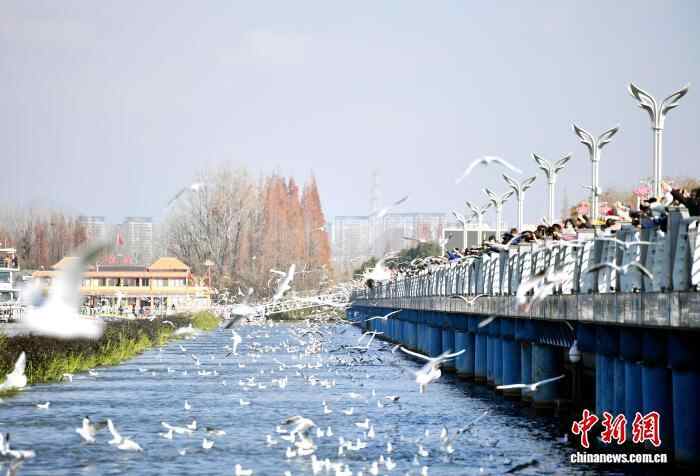 12月20日,众多游客与红嘴鸥互动。当日,众多游客在云南省昆明市滇池畔海埂大坝观鸥、喂鸥。滇池是红嘴鸥在云南的主要越冬地,每年观鸥季,吸引众多游客前来“打卡”。中新社记者 黄兴鸿 摄