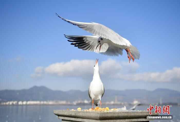 12月20日,两只红嘴鸥互动。当日,众多游客在云南省昆明市滇池畔海埂大坝观鸥、喂鸥。滇池是红嘴鸥在云南的主要越冬地,每年观鸥季,吸引众多游客前来“打卡”。中新社记者 黄兴鸿 摄