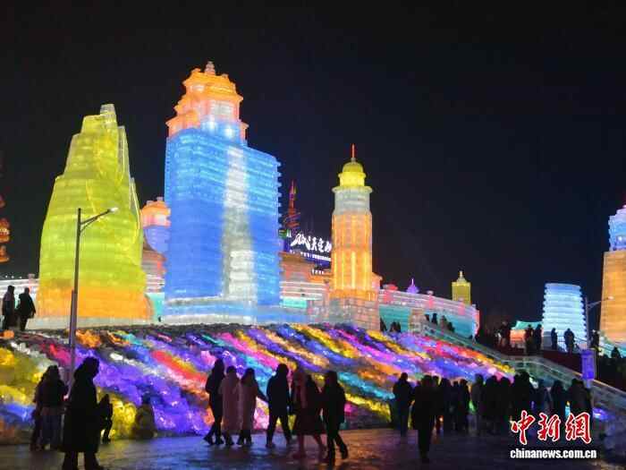 12月19日晚,长春冰雪新天地开门迎客。2025-2026雪季的长春冰雪新天地占地面积156万平方米,开发了76万平方米的冰雪游乐空间,总用冰用雪量达85万立方米,冰雪雕塑200余座。随着夜幕降临,冰雕景观亮灯,整个园区仿佛一座如梦如幻的冰雪王国。中新社记者 张瑶 摄