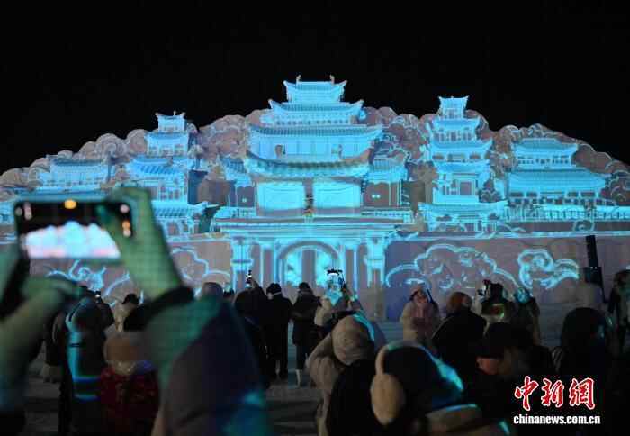 12月26日晚,吉林长白山,新落成的高30米、宽70米、用雪量10万立方米的雪雕版“云顶天宫”正式点亮。中新社记者 张瑶 摄