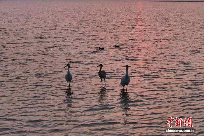 图为几只候鸟在湖面上觅食休憩。(无人机照片)中新社记者 韩苏原 摄