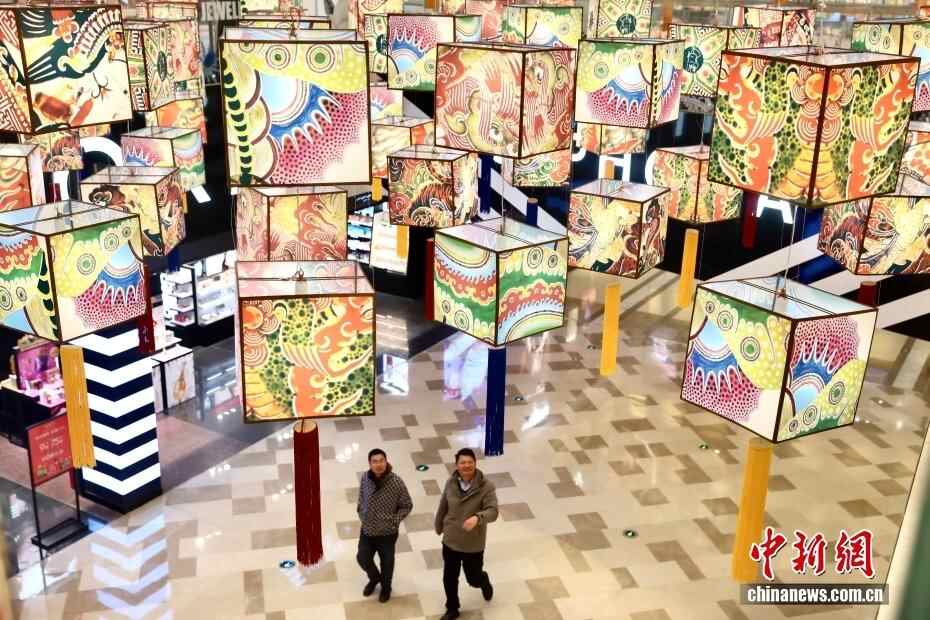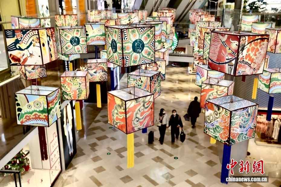 12月24日,“汪氏皮影”走进北京西单大悦城商场,吸引了不少市民参观。图为装饰有皮影的灯笼。