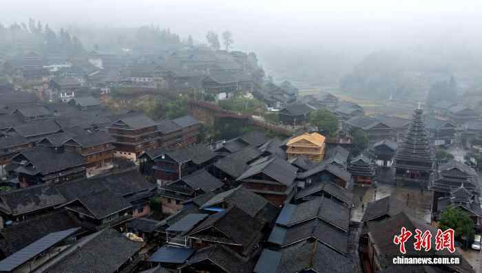 航拍三江侗族自治县林溪镇高友村,烟雨中的侗寨如一幅水墨画卷。龚普康 摄