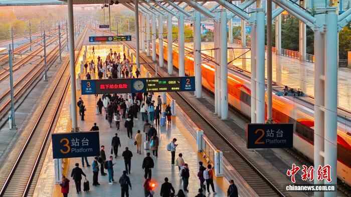 近日,河南洛阳龙门车站沐浴在夕阳霞光中,身披金辉的高铁列车与绚烂晚霞相映成趣。光影交织间,旅客出行的匆忙与落日的柔美碰撞,勾勒出一幅诗意的旅途画卷。图为旅客在夕阳下的高铁站台候车。任伟峰 摄