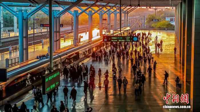 图为旅客穿梭在霞光里的高铁站台。任伟峰 摄