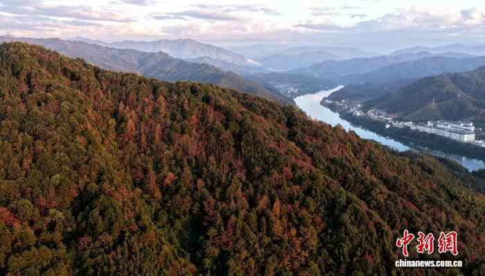 近日,无人机俯瞰广西三江侗族自治县古宜镇厘金滩水电站一带,“彩虹森林”层林尽染,色彩斑斓如织锦,浔江楼与远山共沐霞光,绘就一幅侗乡冬日诗意画卷,美不胜收。图为三江厘金滩水电站一带风光。龚普康 摄