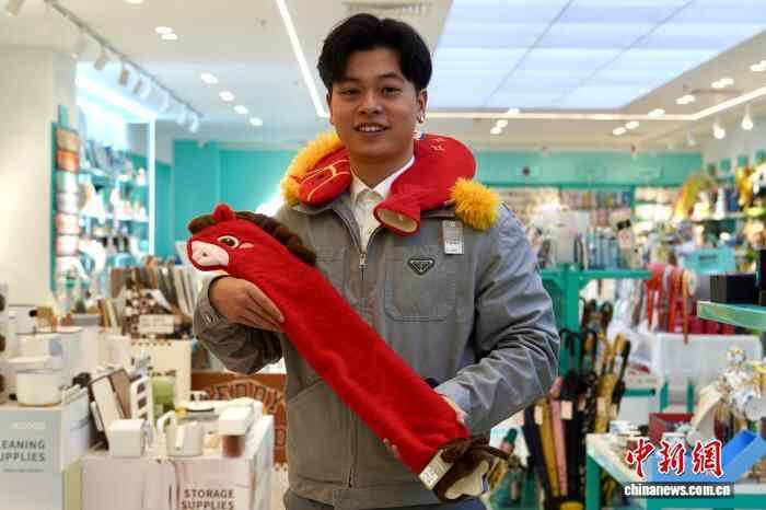 12月6日,商户骆添乐展示以马为外观造型的两款热水袋。中新社记者 董易鑫 摄